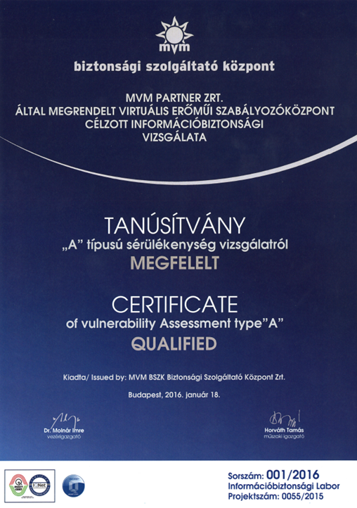 When selecting system components, MVM Partner Ltd. focused on high availability and industry standards (HP, Cisco, Siemens). Regarding information security, the system also complies with industry-specific requirements, standards and the MVM Group's high-level security requirements. To support these requirements, in January 2016, the Small Power Plant Control Centre obtained MVM BSZK Ltd.'s Type "A" information security certificate, which is unique in the market.